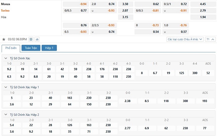 Bảng tỷ lệ kèo bóng đá trận đấu Monza vs Torino